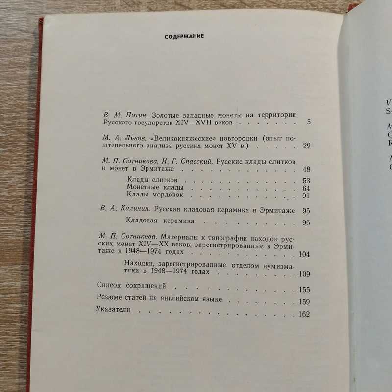 `Содержание: Золотые западные монеты на территории Русского государства XIV - XVII веков, `Великокняжеские` новгородки (опыт поштемпельного анализа русских монет XV в.), Русские клады слитков и монет в Эрмитаже, Русская кладовая керамика в Эрмитаже, Материалы к топографии находок русских монет XIV - XX веков, зарегистрированные в Эрмитаже в 1948 - 1974 годах. Список сокращений. Резюме статей на английском языке. Тир. 3000 экз.