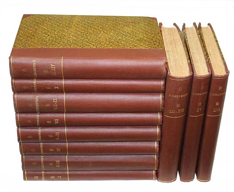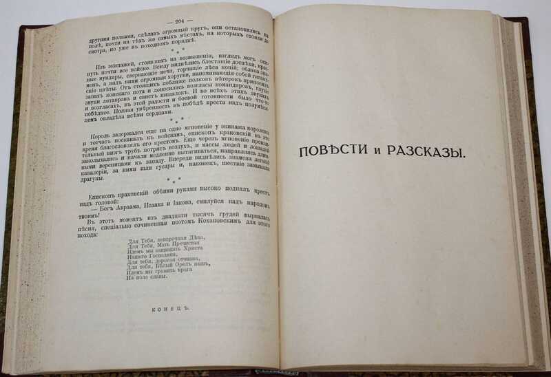 Кн.1 (Т.1): Рассказы. – 330 с., 1 л. портр.; Кн.2 (Т.2-3): Огнем и мечем. – 298 с.; 295 с.; Кн.3 (Т.4): Потоп. – 480 с.; Кн.4 (Т.5-6): Потоп (продолжение). – 481-955 с.; Кн.5 (Т.7): Пан Володыевский. – 407 с..; Кн.6 (Т.8-9): Семья Поланецких. – 568 с.; Кн.8 (Т.11, Т.14): Без догмата. – 303 с.; В пустыне и дебрях. – 240 с.; Кн.9 (Т.12-13): Меченосцы. – 591 с.; Кн.10 (Т.15): Камо грядеши? – 412 с.; Кн.11 (Т.16): На поле славы. Повести и рассказы. – 398, [2] с. /// Генрик Сенкевич (1846-1916) – польский писатель, известен как автор исторических романов, лауреат Нобелевской премии по литературе 1905 г. Был самым издаваемым автором второй половины ХХ в. в Польше. Прижизненное издание.