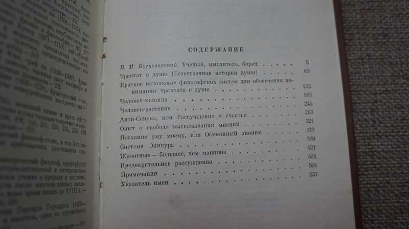 Жюльен Офре де Ламетри - первый французский мыслитель ХVIII века выступивший в печати с открытой защитой материалистических и атеистических взглядов. Содержание: Трактат о душе. - Краткое изложение философских систем для облегчения понимания трактата о душе. - Человек-машина. - Человек-растение. - Анти-Сенека, или рассуждение о счастье. - Опыт о свободе высказывания мнений. - Послание уму моему, или Осмеянный аноним. - Система Эпикура. - Животные - большее, чем машины. - Предварительное рассуждение. - Примечания. - Указатель имен.