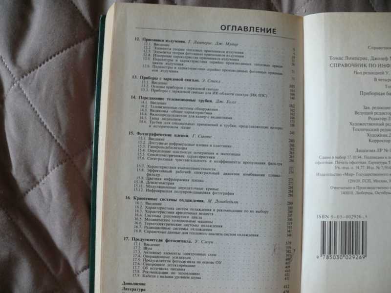 Фундаментальный справочник по ИК-технике, составленный группой ведущих американских специалистов по заказу правительства США и охватывающий широкий крут вопросов физики и техники ИК-излучения. В т. 1 излагаются основные сведения по физике ИК-излучения, источники излучения и его прохождение через атмосферу ( поглощение, рассеяние, явления турбулентности). В т. 2 рассматриваются материалы, элементы и проектирование оптических систем, оптико-меаническое сканирование, анализ оптического изображения. . В т. 3 рассматривается приборная база ИК-систем: приемники ИК-излучения, системы охлаждения и электроника фотоприемных устройств, индикаторные устройства.