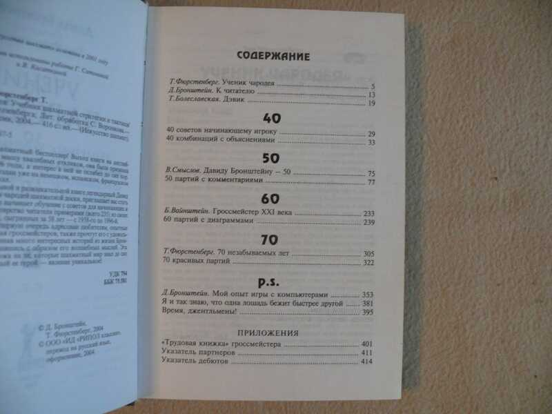 Европейский шахматный бестселлер! Выход книги на английском языке вызвал массу хвалебных откликов, она была признана лучшей книгой 1996 года, а интерес к ней не ослабел до сих пор. `Ученик чародея` издан уже на немецком, испанском, французском и итальянском языках. В этой поучительной и развлекательной книге легендарный Давид Бронштейн, артист и чародей шахматной доски, приглашает вас стать его учеником. Автор начинает обучение с советов для начинающих и затем развивает мастерство читателя примерами (всего 235) из своих собственных партий, сыгранных за 58 лет - с 1938-го по 1996-й. Хотя учебник в первую очередь адресован любителям, опытные шахматисты, включая гроссмейстеров, также прочтут его с удовольствием и пользой, узнав много интересных историй из жизни Бронштейна и познакомившись с образом его волшебных мыслей. Эта книга совсем непохожа на те, которые шахматный мир знал до сих пор, но ведь и главный ее герой - явление уникальное! Содержание: 15 партий с компьютерами. 40 советов начинающему игроку. 40 комбинаций с объяснениями. 50 партий с комментариями. 60 партий с диаграммами. 70 красивых партий.