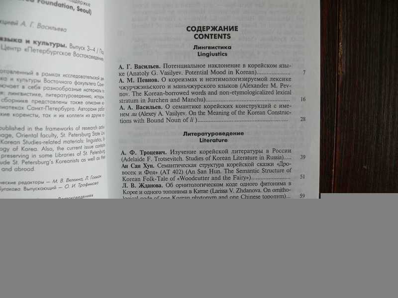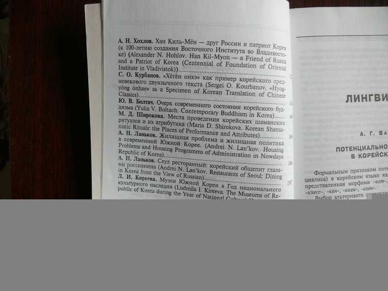 А.Г. Васильев. Потенциальное наклонение в корейском языке, А.М. Певнов. О кореизмах и неэтимологизируемой лексике чжурчжэньского и маньчжурского языков, А.А. Васильев. О семантике корейских конструкций с именем ``ли``, А.Ф. Троцевич. Изучение корейской литературы в России, Ан Сан Хун. Семантическая структура корейской сказки «Дровосек и Фея», Л.В. Жданова. Об орнитологическом коде одного фитонима в Корее и одного топонима в Китае, Б. Б. Пак. Русско-корейский договор о сухопутной торговле 1888 г., Т.М. Симбирцева. Пребывание в Корее экспедиции адмирала Путятина (1854) и некоторые ее оценки в южнокорейской историографии, А.Н. Хохлов. Хан Киль-Мен - друг России и патриот Кореи (к 100-летию создания Восточного Института во Владивостоке), С.О. Курбанов. «Хеген онхэ» как пример корейского средневекового двуязычного текста, Ю.В. Болтач. Очерк современного состояния корейского буддизма, М.Д. Широкова. Места проведения корейских шаманских ритуалов и их атрибутика, А.Н. Ланьков. Жилищная проблема и жилищная политика в современной Южной Корее, А.Н. Ланьков. Сеул ресторанный: корейский общепит глазами россиянина, Л.И. Киреева. Музеи Южной Кореи в Год национального культурного наследия, Корейские фонды в библиотеках Санкт-Петербурга, А.Ф. Троцевич. Корейские письменные памятники в фонде китайских ксилографов Восточного отдела Научной библиотеки Санкт-Петербургского государственного университета, А.А. Артемьева. Из истории Корейского фонда Отдела литературы стран Азии и Африки Российской Национальной библиотеки. Тираж 400 экз.