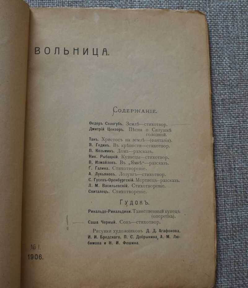 Литературно-художественный журнал. Всего вышло 2 выпуска. Издание приостановлено решением Петерб. Суд. Палаты от 29.03.1906. Запрещенный сборник эпохи первой революции ( был конфискован полицией). В номере: Сологуб Ф. Земле—стихотвор. — Цензор Д. Песня о Силушке голодной. — Тан. Христос на земле. — Годин Я. В крепости. — Козьмин П. Дома. — Рыбацкий Ник. Кузнецы. — Измаилов В. В ямке. — Галина Г. Стихотворение. — Лукьянов А. Лозунг. — Гусев-Оренбургский С. Мертвец. — Васильевский Л.М. Стихотворение. — Скиталец. Стихотворение. — Гудок: Ринальдо-Ринальдини. Таинственный купец. — Саша Черный. Сон.