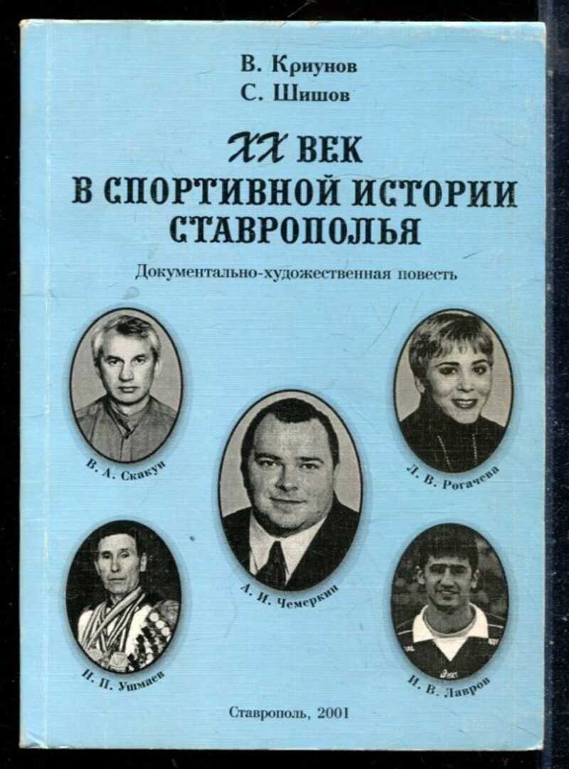 В книге В. Криунова и С. Шишова «XX век в спортивной истории Ставрополья» представлена хроника развития спорта в регионе на протяжении столетия. Авторы рассказывают о выдающихся спортсменах, тренерах и организаторах физкультурного движения, чьи усилия прославили Ставрополье на всероссийских и международных соревнованиях. Особое внимание уделено роли физической культуры в оздоровлении населения края. Издание включает статистические данные, исторические фотографии и воспоминания участников спортивного движения, создавая объёмную картину становления спорта в регионе.