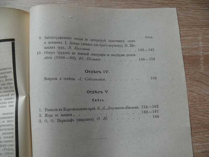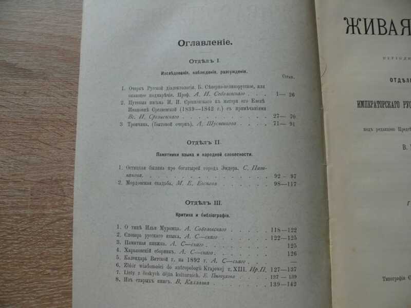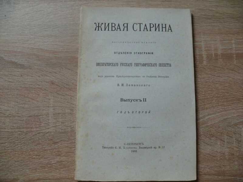 Очерк русской диалектологии. Северно-великорусское, или окающее поднаречие. Путевые письма И. И. Срезневского к матери Елене Ивановне Срезневской (1839-1842 г.). С предисловием ред. и прим. Вс. И. Срезневского.Троичина. (Бытовой очерк). Остяцкая былина про богатырей города Эмдера. Мордовская свадьба. О типе Ильи Муромца. - Словарь русского языка. Памятная книжка. Харьковский сборник. Календарь Вятской г. на 1892 `Живая старина` — журнал, издававшийся с 1891 по 1916 Этнографическим отделением Императорского русского географического общества в Санкт-Петербурге. Выходил в Петербурге под ред. В.И. Ламанского четыре раза в год. Основное внимание уделялось этнографии и фольклору народов, населявших Российскую империю; время от времени появлялись заметки и о зарубежных народах. Подробно рассматривались быт и материальная культура (семейный уклад, хозяйство, жилища, одежда и т. д.). Журнал публиковал отчеты об этнографических экспедициях, программы сбора этнографических сведений. При `Живой старине` имелся значительный критико-библиографический отдел. Журнал сыграл важную роль в развитии русской этнографии. Состоял из пяти отделов: 1. Исследования, наблюдения, рассуждения; 2. Памятники языка и народной словесности; 3. Критика и библиография; 4. Вопросы и ответы; 5. Смесь. В отделе `Исследования, наблюдения, рассуждения` печатались научные статьи по этнографии, фольклору и лингвистике различных народностей, как славянских, так и других стран. Статьи по этнографии русского населения касались описаний семейных обрядов и праздников. Из фольклорных материалов преобладали публикации текстов былин, сказок и песен. Особое внимание среди лингвистических исследований было уделено истории старославянского языка и специфике великорусских говоров. Ряд статей касается описания религиозных практик и течений русского и украинского населения страны. В разделе `Памятники языка и народной словесности` публиковались необработанные, научно неосмысленные и небольшие по объему фольклорно-этнографические материалы, собранные членами-сотрудниками во время этнографических поездок или присланные в Общество членами-корреспондентами. По своему содержанию печатаемые здесь сведения имели такой же разнообразный характер, как и статьи из первого отдела. В `Критике и библиографии` помещались рецензии на российские и иностранные издания, библиографические обзоры этнографической литературы, списки работ ученых, специальные библиографические указатели периодических изданий или этнографической литературы различных народностей. В рубрике `Вопросы и ответы` печатались программы и письма с просьбой о доставки сведений по тем или иным этнографическим проблемам. Отдел `Смесь` вмещал в себя краткие заметки фольклорного, этнографического или лингвистического содержания, некрологи, информацию о деятельности фольклорных и этнографических учреждений страны, в том числе с 1904 года протоколы заседаний и годовые отчеты Отделения этнографии.