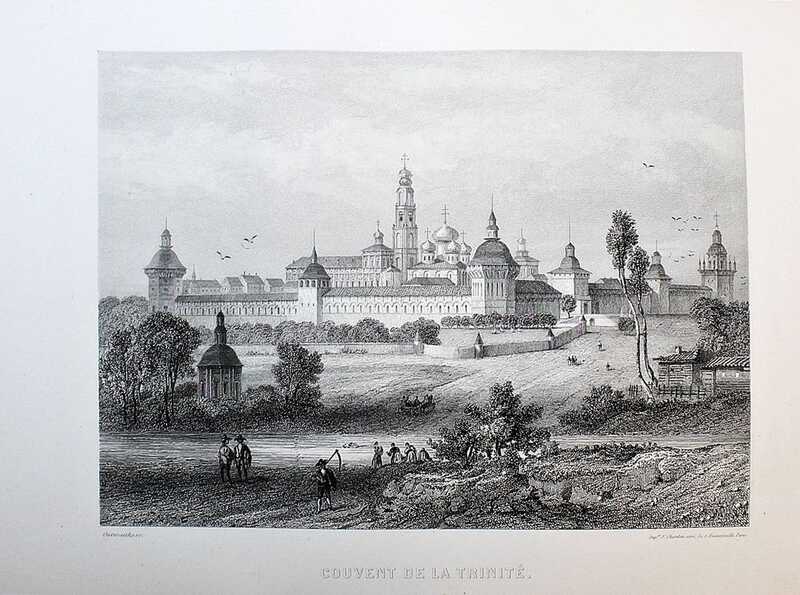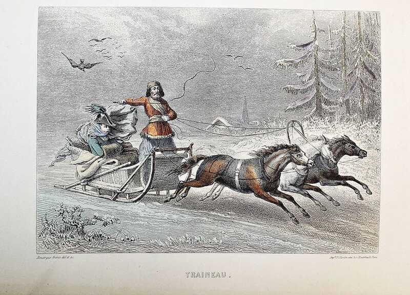 Сен-Жюльен де Шарль (1802–1869) - французский журналист и литератор, служивший в Петербурге секретарем и библиотекарем у графа И.С.Лаваля, издатель петербургской газеты Le Furet, преподаватель французской литературы в Петербургском университете; Рауль Бурдье — французский писатель, переводчик и путешественник /// Издание иллюстрировано 20 гравюрами работы Руарга, Утвэта и Керно на отдельных листах, (некоторые гравюры — с неполной ручной акварельной раскраской). В первой части книги рассказывается о Санкт-Петербурге, Царском Селе, Гатчине, Павловске, Ораниенбауме, парковом ансамбле Петергофа. Отдельные главы посвящены Финляндии и Москве. Вторая часть книги посвящена поездке в Нижний Новгород, третья - на Кавказ, четвертая в Сибирь и на Камчатку.