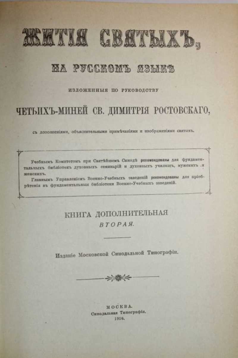 Репринтное издание: МОСКВА. Синодальная типография. 1916. Жития святых, на русском языке изложенные по руководству Четьих-Миней Св. Димитрия Ростовского с дополнениями, объяснительными примечаниями и изображениями святых. Книга дополнительная вторая. Жития русских святых. (Январь-апрель).