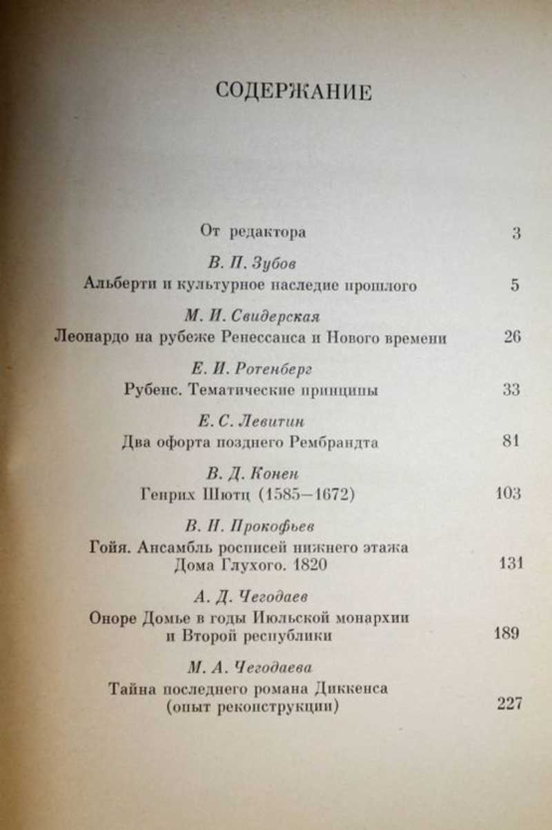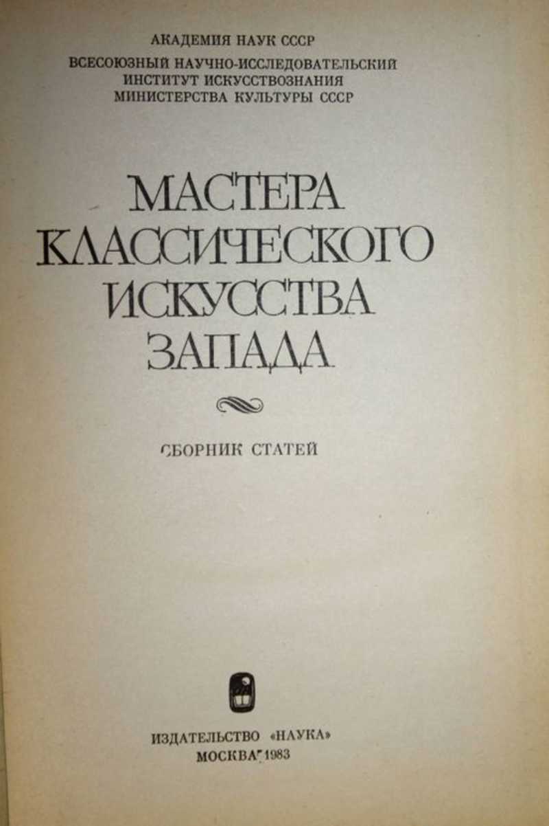 Сборник `Мастера классического искусства Запада` продолжает серию аналогичных изданий, уже в течение пятнадцати лет публикуемых Сектором классического искусства Запада Всесоюзного научно-исследовательского института Министерства культуры СССР. По сложившейся традиции он носит комплексный характер, включая работы, посвященные различным видам искусства. Статьи сборника, охватывающие большой исторический период, освещают творчество знаменитых мастеров архитектуры, живописи, скульптуры, музыки, литературы. Помимо сотрудников Института в сборнике участвуют ученые из Государственного музея изобразительных искусств имени А. С. Пушкина. Здесь же впервые печатается глава из неопубликованной диссертации `Архитектурная теория Альберти` (1946 г.) известного советского ученого Василия Павловича Зубова (1899 - 1963). Содержание: В. П. Зубов - `Альберти и культурное наследие прошлого`. М. И. Свидерская - `Леонардо на рубеже Ренессанса и Нового времени`. Е. И. Ротенберг - `Рубенс. Тематические принципы`. Е. С. Левитин - `Два офорта позднего Рембрандта`. В. Д. Конен - `Генрих Шютц (1585-1672)`. В. Н. Прокофьев - `Гойя. Ансамбль росписей нижнего этажа Дома Глухого. 1820`. А. Д. Чегодаев - `Оноре Домье в годы Июльской монархии и Второй республики`. М. А. Чегодаева - `Тайна последнего романа Диккенса (опыт реконструкции).
