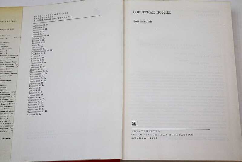 «Советская поэзия» - гигантская «тысячелистая» (В.Маяковский) книга советской многонациональной поэзии. Дыханием времени веет с ее страниц. Листая эти два огромных тома, попадаешь в атмосферу революционной эпохи, острейших социальных конфликтов, строительного энтузиазма, народного подвига в защите родины, свершения великих дел. Каждый поэт говорит «о времени и о себе», а вместе они отражают многие существенные черты народной жизни на более чем полувековом отрезке истории. Вступительная статья Ал.Михайлова, примечания Л.Осиповой. В первый том (912 стр.) вошли стихотворения таких поэтов как: Джамбул Джабаев, Токтогул, Валерий Брюсов, Андрей Белый, Алексей Гастев, Садриддин Айни, Сергей Городецкий, Николай Клюев, Самуил Маршак, Анна Ахматова, Вера Инбер, Борис Пастернак, Михаил Зенкевич, Галактион Табидзе, Павло Тычина, Осип Мандельштам, Рюрик Ивнев, Илья Эренбург, Марина Цветаева, Паоло Яшвили, Вера Звягинцева, Берды Кербабаев, Сайфи Кудаш, Георгий Шенгели, Всеволод Рождественский, Кондрат Крапива, Михась Чарот, Василий Лебедев-Кумач, Расул Рза, Кубанычбек Маликов, Сергей Островой и мн. др. Во второй том вошли стихотворения таких авторов как: Андрей Малышко, Игорь Муратов, Лев Ошанин, Сергей Поделков, Максим Танк, Платон Воронько, Анвар Аджиев, Богдан Истру, Алим Кешоков, Лев Озеров, Амо Сагиян, Ованес Шираз, Павел Шубин, Маргарита Алигер, Евгений Долматовский, Михаил Матусовский, Константин Симонов, Вадим Шефнер, Людмила Татьяничева, Эди Огнецвет, Михаил Дудин, Юрий Левитанский, Муса Гали, Расул Гамзатов, Римма Казакова, Отар Чилиадзе, Новелла Матвеева, Евгений Евтушенко, Юнна Мориц, Белла Ахмадулинаи мн. др.