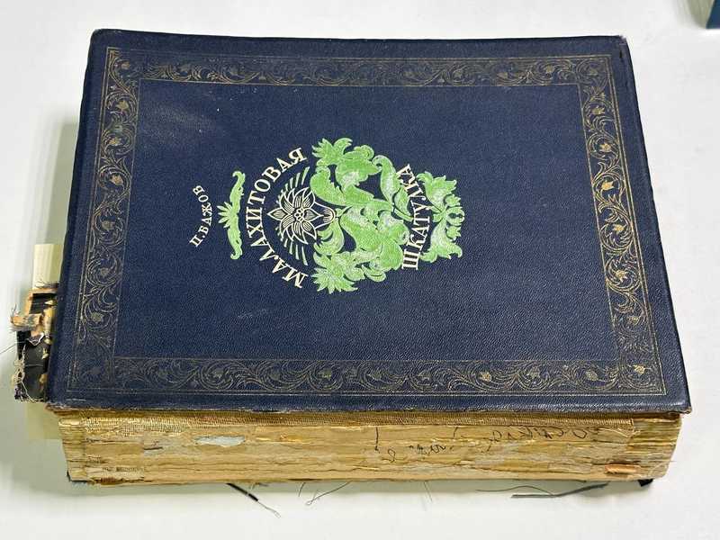 Портрет П. П. Бажова и 17 цветных иллюстраций художника В. Баюскина под пергаментной бумагой на вклеенных паспарту.