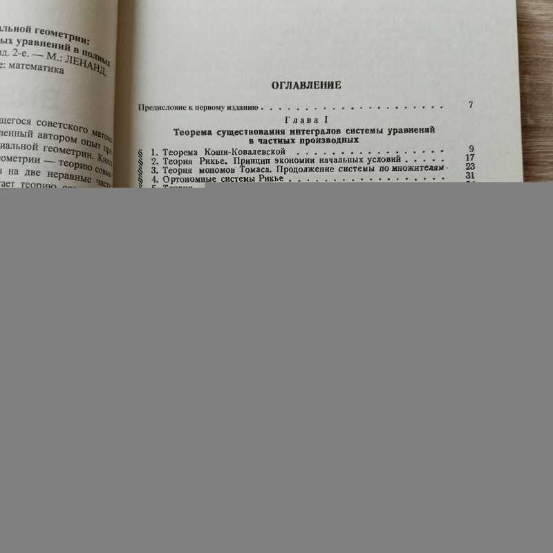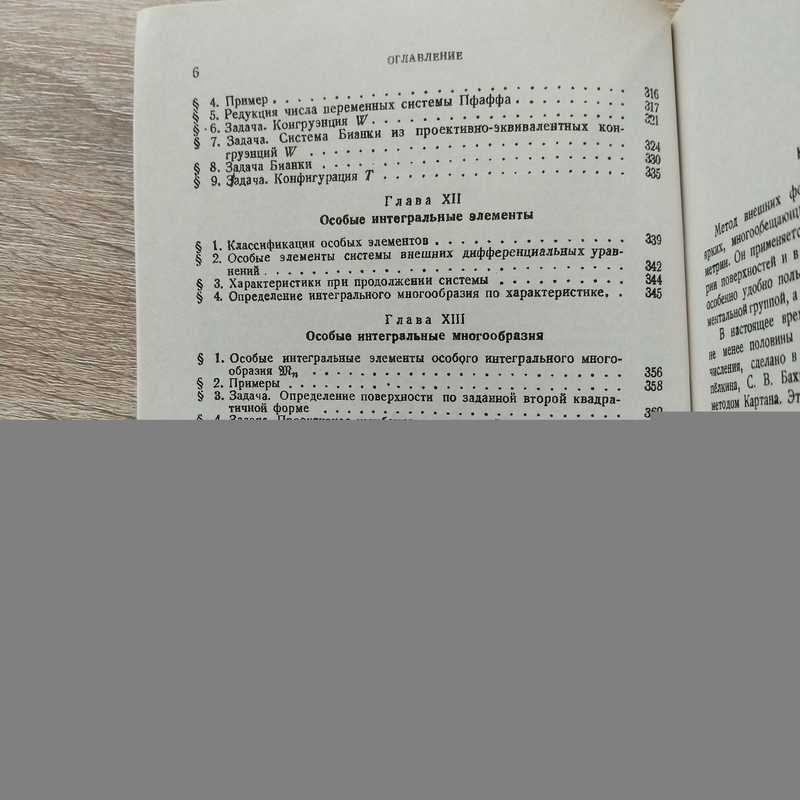 Вниманию читателей предлагается книга выдающегося советского математика С.П.Финикова, цель которой — передать накопленный автором опыт применения метода внешних форм Картана в дифференциальной геометрии. Книга дает аналитические предпосылки дифференциальной геометрии — теорию совместности дифференциальных уравнений, и распадается на две неравные части. Первая часть состоит из одной первой главы и излагает теорию совместности уравнений в частных производных, а именно — теорию ортономных систем Рикье с обобщениями Томаса. Первая часть состоит из одной первой главы и излагает теорию совместности уравнений в частных производных - именно, теорию ортономных систем Рикье с обобщениями Томаса. Вторую часть составляют остальные 13 глав, посвященные картановской теории систем в инволюции. Обе части вполне самостоятельны и могут читаться независимо одна от другой. Их взаимоотношение показано на примере § 4 гл. XII. Алгебраическая сторона картановской символики изложена во II и IV главах. Они разделены гл. III, посвященной теории вполне интегрируемых систем, для того чтобы можно было изложить в IV главе теорию характеристических систем. Аналитическая теория изложена в главах VI - VII. Гл. VI содержит основную теорему существования Картана для пфаффовых систем в инволюции. Гл. VII распространяет ее на произвольные системы внешних дифференциальных уравнений. Все дальнейшее изложение построено так, чтобы читатель, интересующийся только пфаффовыми системами, мог гл. VII не читать. Главы VIII и IX дают основной механизм исследования пфаффовых систем (приведение в инволюцию). Главы V и X стоят особняком и могут при чтении опускаться. Гл. XI заново выводит и дополняет теорию характеристических систем гл. IV. Здесь следует отметить два приложения к геометрии: редукцию переменных пфаффовой системы (§ 5) и метод Бам-Зеликовича при решении задачи Бианки (§ 8). Главы XII и XIII посвящены классификации особых элементов и проблеме особых интегральных многообразий. Книга рекомендуется математикам, механикам, физикам-теоретикам — научным работникам, преподавателям, аспирантам и студентам естественных вузов.