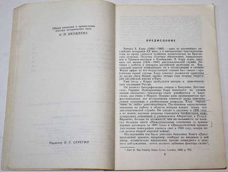 Эдвард Карр (1892-1982) - один из крупнейших английских историков ХХ века, классик западной советологии. Его монументальный труд `История Советской России` состоит из 14 томов, охватывающих широчайший круг вопрсов, относящихся к истории трех русских революций, эпохи становления и противоречивого развития Советского государства, взаимоотношения большевистской партии с другиим политическими силами страны, роли личностей в советской истории, здесь трактуются проблемы политического, экономического и конституционного строя СССР, всесторонне анализируется международная обстановка и реакция в мире на события в Советском Союзе до 1929 года. Предлагаемая книга представляет собой 1-й и 2-ой тома. Остальные тома на русском языке не выходили. Только для первых двух томов – из предполагавшихся 14-ти – автором был обработан такой обширный фактический материал, что потребовалось 2314 ссылок на источники. Карром, например, очень кропотливо прослежен процесс намеренного устранения отношений терпимости в высших партийно-правительственных кругах и создания основ будущей империи Сталина. Разделы: Человек и орудие. Конституционная структура. Распад и воссоединение. Экономический порядок.