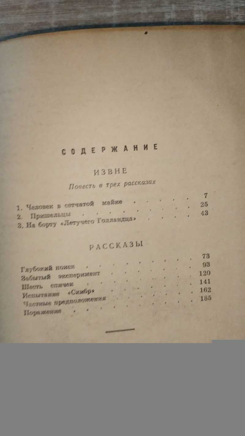 Первый сборник рассказов Стругацких. С о д е р ж а н и е: Извне (повесть в трех рассказах). Глубокий поиск. Забытый эксперимент. Шесть спичек. Испытание Скибр. Частные предположения. Поражение. Из обращения к читателям: «На страницах сборника *Шесть спичек* вы познакомитесь с новыми научно-фантастическими произведениями братьев Аркадия и Бориса Стругацких, имена которых вам могут быть известны по их первой повести *В стране багровых туч*, вышедшей в свет в 1959 году».