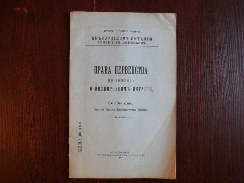 Научная конкуренция за первенство была в разгаре уже в начале прошлого века. Здесь секретарь Русского Энтомологического Общества Иван Шевырев обличает В. Врадия и Г. Мокржецкого в том, что они выдают за свои его заслуги в области Внекорневого Питания. приводится дискуссия по этому поводу. Книга отсутствует в каталоге ГПБ. Иван Яковлевич Шевырёв (1859 — 7 июля 1920) — русский энтомолог, специалист в области лесной энтомологии, открывший сложные аспекты биологии жуков-короедов. Иван Шевырёв родился в 1859 году в городе Харькове. Среднее образование получил в харьковской 3-й гимназии, где кончил курс в 1878 году. В 1883 году окончил физико-математический факультет Харьковского университета. Был воспитателем при пансионе гимназии Гуревича в 1884 году. В 1887—1897 годах работал в Лесном институте в Санкт-Петербурге и в 1898—1917 годах — в Лесном департаменте Министерства земледелия и государственных имуществ. Основные труды посвящены лесной энтомологии. Главным образом Иван Яковлевич изучал короедов и других вредителей древесных пород. Он начал изучение насекомых степных искусственно разведённых лесов. Ряд его работ посвящены паразитическим перепончатокрылым. Шевырёвым предложен точный метод для изучения личинок перепончатокрылых. Ему принадлежит также идея метода интоксикации растений для уничтожения вредителей. Под его редакцией изданы переводы сочинений Фабра и Штандфуса. Иван Яковлевич Шевырёв умер 7 июля 1920 года. Работы И. Шевырева: Отчёт по исследованию вредных насекомых степных лесничеств (1891—1893). Описание вредных насекомых степных лесничеств и способов борьбы с ними (1893). Шелкопряд-монашенка (1894). Друзья и враги плодового сада (1900). Внекорневое питание больных деревьев с целью их лечения и уничтожения паразитов, (статья в журнале «Сельское хозяйство и лесоводство», 1903). Загадка короедов (1910). Паразиты и сверхпаразиты из мира насекомых (1912). Как