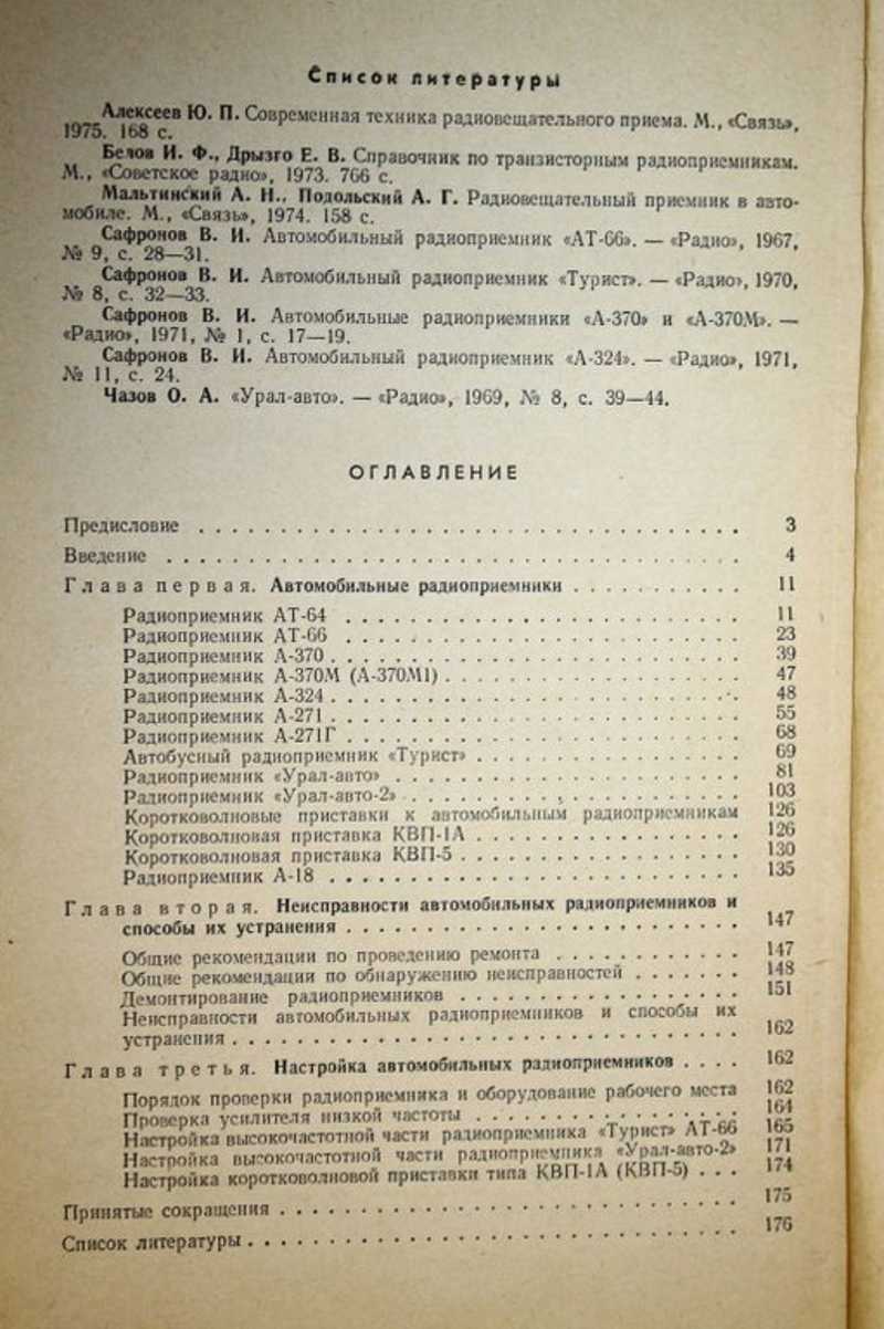 Приводятся данные по эксплуатации автомобильных радиоприемников: эксплуатационные характеристики, принцип и режимы работы, принципиальные и электромонтажные схемы, моточные данные контуров, дросселей и трансформаторов, конструкция радиоприемников. Даны рекомендации по обнаружению неисправностей радиоприемников. Изложены методы настройки автомобильных радиоприемников и способы измерения их основных параметров.