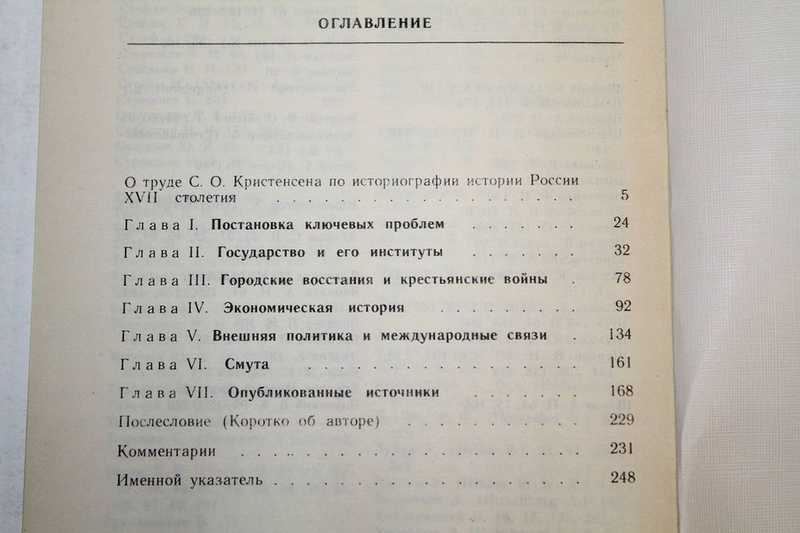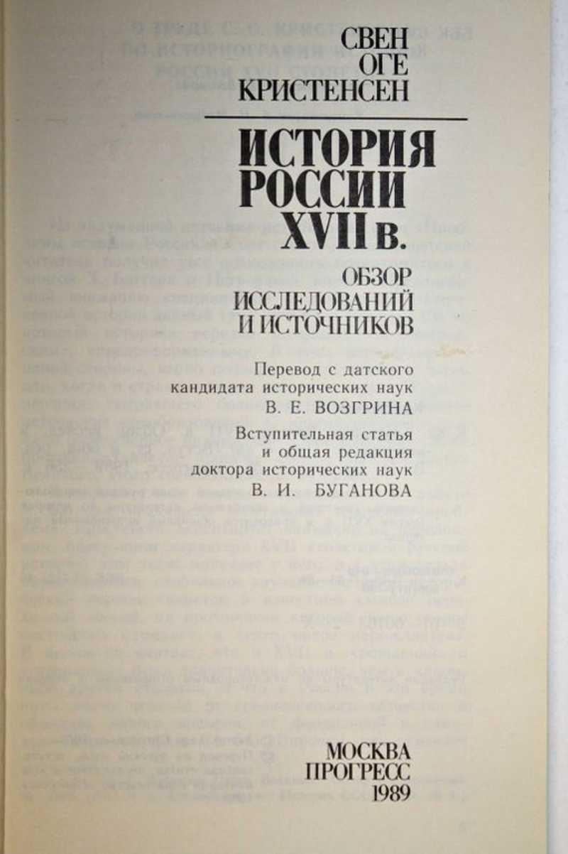 Книга известного датского историка Свена Оге Кристенсена — обширный источник историографических знаний о России XVII века. Здесь сведены существующие в науке концепции как отдельных историографических проблем, так и целых их комплексов. Рассмотрено 800 монографий, статей, публикаций источников, приведены многочисленные примеры важных, пока научно не разработанных тем. Труд С. О. Кристенсена — значительное явление в мировой историографии России XVII века. В книге дается аналитический обзор русской дореволюционной, советской и зарубежной литературы по истории России XVII в. и приводится обширный источниковый материал.