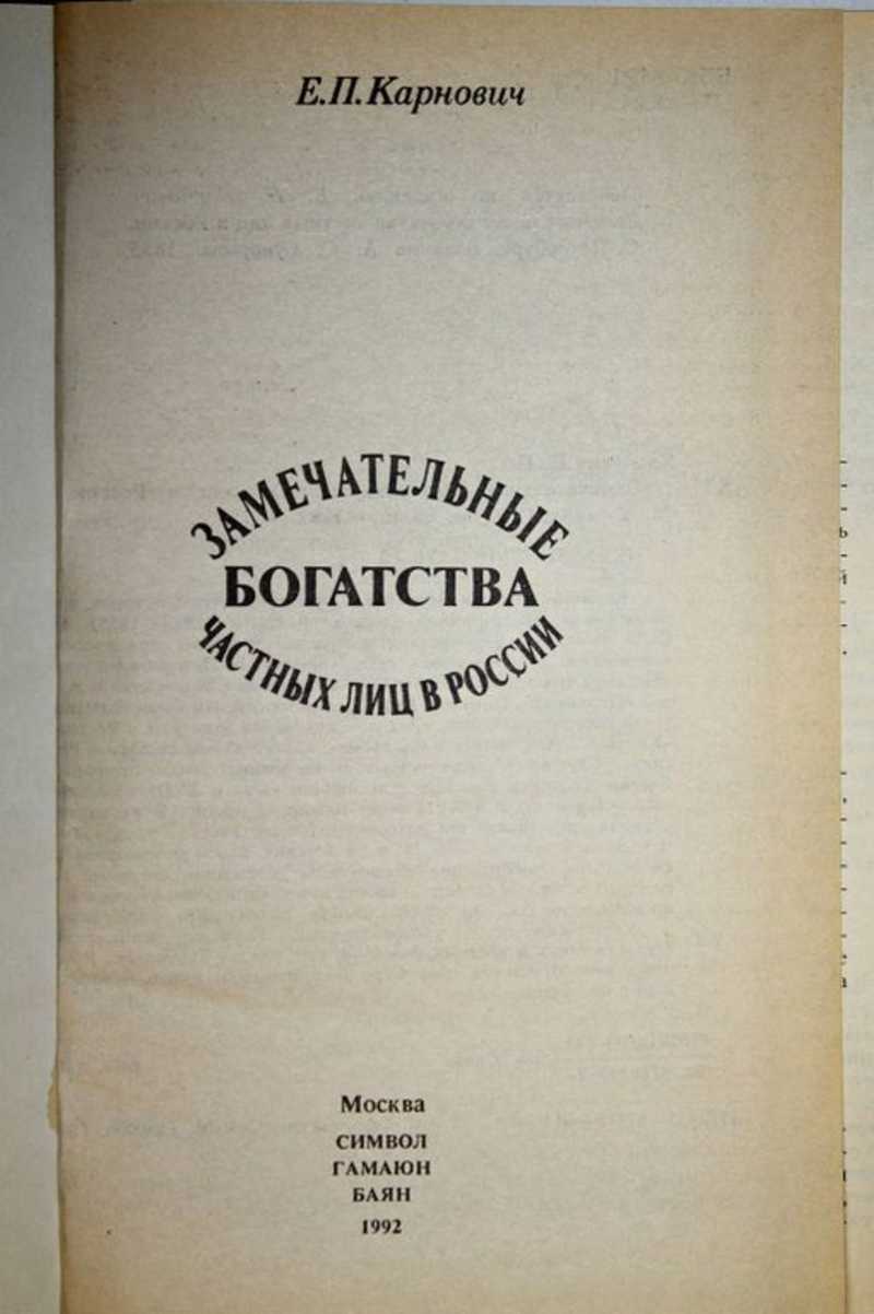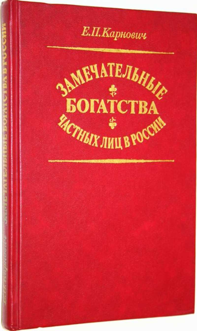 Евгений Петрович Карнович - русский писатель-историк, происходивший из старинной дворянской семьи (1823-1885). Им были написаны многочисленные публицистические, юридические, критические, исторические статьи. В настоящем издании представлен его историко-публицистический труд `Замечательные богатства частных лиц России`. В нем рассматриваются способы приобретения значительных состояний частными лицами за счет государства, состовление капиталов торговлей и промышленностью, пути обогащения различными служебными и общественными злоупотреблениями. Показано становление богатств таких известных фамилий, как: князья Трубецкие, Ромодановские, Меншиков, граф Строганов, промышленники Демидовы и многие другие.