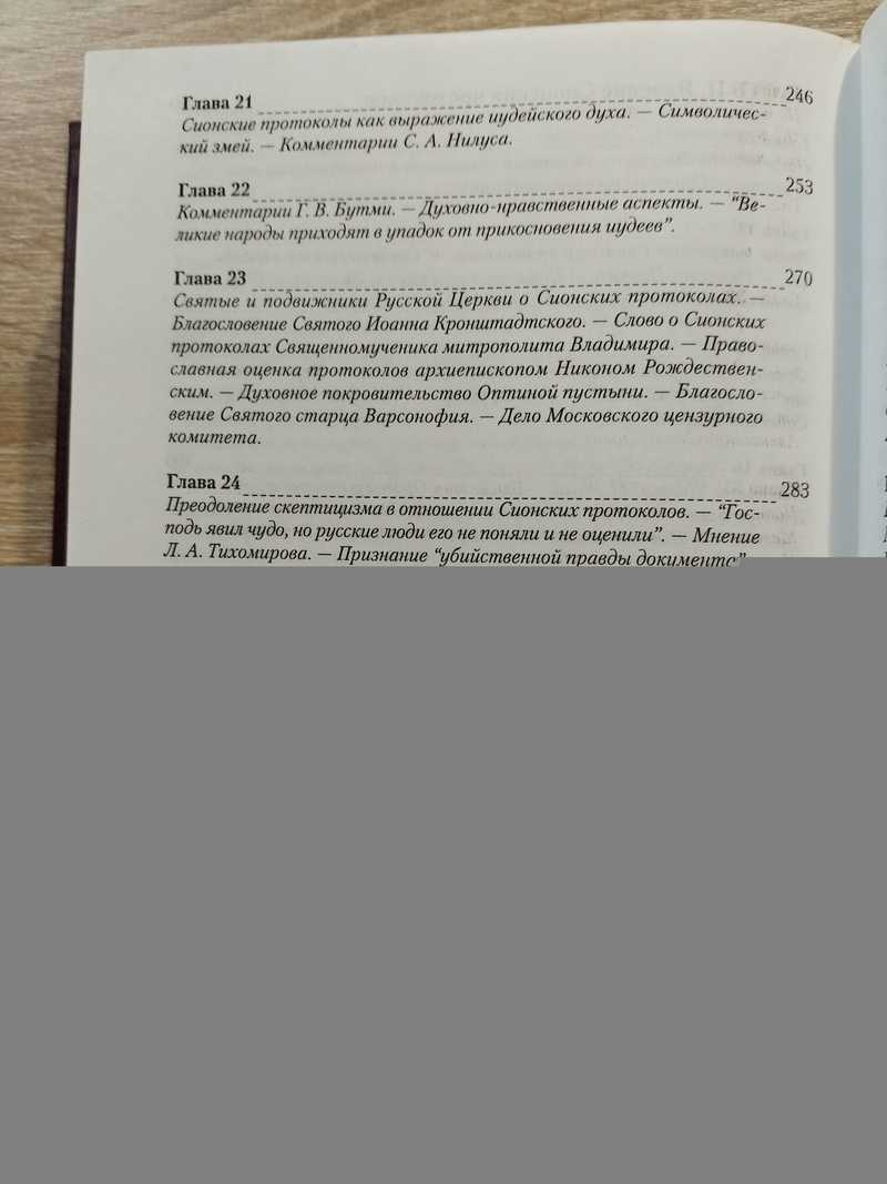 Книга посвящена изучению самого загадочного документа XX века - Протоколов сионских мудрецов - обобщающего произведения иудейско-талмудической мысли, программы тайной войны против Христианской цивилизации. Автор прослеживает более 2500-летний путь развития идеологии Сионских протоколов: от возникновения Талмуда и расовой доктрины иудаизма до создания современных иудейско-масонских и сионистских организаций мирового господства, в частности Совета по международным отношениям, Трехсторонней комиссии, Бильдербергского клуба, Мирового Форума. В книге использованы ранее не публиковавшиеся материалы Бернского процесса и переписка его участников, подтверждающие, что показания свидетелей и экспертов, оспаривавших на суде подлинность Сионских протоколов, были фальсифицированы и заранее оплачены иудейскими организациями. Главными источниками архивных материалов для этой книги стали Государственный архив Российской Федерации, Центр хранения историко-документальной коллекции (бывший Особый архив СССР), архив Свято-Троицкого монастыря (Джорданвилль, США) и архив Гуверовского института (Станфорд, США). Книга снабжена уникальным словарем мировой закулисы.