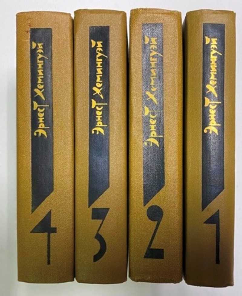 Собрание сочинений крупнейшего американского писателя Эрнеста Хемингуэя (1899-1961). Содержание: Том 1. Рассказы. Очерки. Фиеста (И выходит солнце) (роман). - Том 2. Прощай, оружие! Иметь и не иметь. За рекой, в тени деревьев (романы). Очерки о Второй Мировой войне. - Том 3. Пятая колонна (пьеса). По ком звонит колокол (роман). Рассказы. Очерки. Речи. - Том 4. Старик и море (повесть). Опасное лето (очерки о бое быков). Праздник, который всегда с тобой (воспоминания). Острова в океане (роман). Летопись жизни и творчества Э.Хемингуэя (А.Старцев). Тираж 200000 экз.