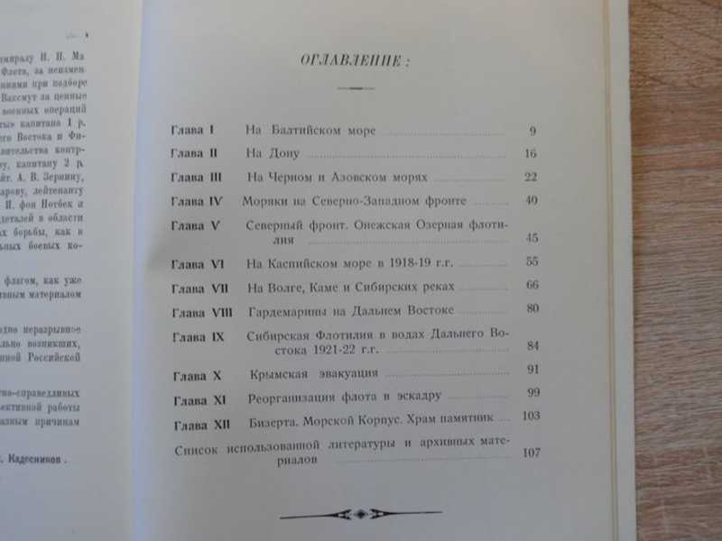 Аннотация А.Савина: `Первое издание. Тираж 500 экз. С 6 редчайшими фотографиями эпохи на отдельных листах. Отпечатано на плотной бумаге высокого качества. Содержание: На Балтийском море. - На Дону. - На Черном и Азовском морях. - Моряки на Северо-Западном фронте. - Северный фронт. - Онежская озерная флотилия. - На Каспийском море в 1918-19 гг. - На Волге, Каме и Сибирских реках. - Гардемарины на Дальнем Востоке. - Сибирская флотилия в водах Дальнего Востока 1921-1922 гг. - Крымская эвакуация. - Реорганизация флота в эскадру. - Бизерта. - Морской корпус. - Храм памятник. - Список использованной литературы и архивных материалов. Труд был составлен на основании некоторых сохранившихся частных архивов, описаний отдельных эпизодов в русской зарубежной морской печати и воспоминаний участников. Свидетельства непосредственных участников описываемых событий. Николай Зотикович Кадесников (1895—1971) — активный участник Белой борьбы с первых дней февральской революции до эвакуации из Крыма, инженер-механик, лейтенант Русского императорского флота, педагог. С прекрасным предисловием известного русского писателя И.С.Шмелева. Богатый документальный материал (неизвестный и нигде больше не опубликованный ): манифест Верховного правителя адмирала Колчака от 18-го ноября 1918 г., списки личного состава, приказы и резолюции командования флотом. Первый и (единственный) опыт связать в одно неразрывное целое действия отдельных Белых флотилий, самостоятельно возникших по всем окраинам взабаламученной Российской Империи в период Гражданской войны. Ценнейшие и неизученные пока материалы по истории гражданской войны в России. Исключительная редкость, книга не поступала в широкую продажу`.