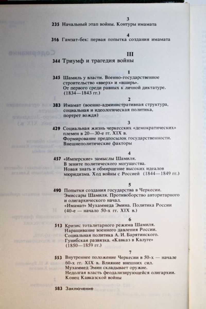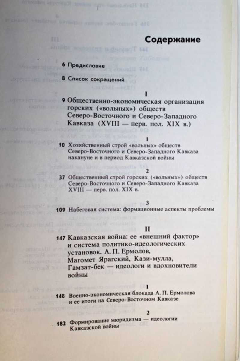Работа над монографией велась на протяжении более десяти лет. Расставаясь с родовой организацией общественной жизни горские племена, объединенные в «вольные» общества, в XIX в. изумили Россию и Европу не только героизмом, кровью и разрушениями, но и созданием в небывало короткие сроки нового общества, его ранней формы государственной организации. Это был первый крупномасштабный шаг к новому общественному порядку, занявшему у азиатских и европейских народов столетия. Шаг этот предпринимался несмотря на то, что на пути к новому укладу жизни стояла Россия, к тому времени ставшая сверхдержавой. Трагической кульминацией революционного преобразования «вольных» обществ явилась для горцев Кавказская война, длившаяся более полувека. ОГЛАВЛЕНИЕ: 1. Общественно-экономическая организация горских (вольных) обществ Северного Кавказа (XVIII — перв. пол. XIX в.): 1.1. Хозяйственный строй «вольных» обществ накануне и в период Кавказской войны: 1.2. Общественный строй «вольных» обществ накануне и в период Кавказской войны: 1.3. Набеговая система: формационные аспекты проблемы: 2. Кавказская война: ее «внешний фактор» и система политико-идеологических установок: 2.1 Военно-экономическая блокада А. П. Ермолова и ее итоги на Кавказе: 2.2. Формирование мюридизма — идеологии Кавказской войны: 2.3. Начальный этап войны, контуры имамата: 2.4. Гамзат-бек: первая попытка создания имамата: 3. Триумф и трагедия войны: 3.1. Шамиль у власти: от первого среди равных к личной диктатуре: 3.2. Имамат (военно-административная структура, социальная и идеологическая политика): 3.3. Социальная жизнь черкесских «демократических» племен в 20—30-е гг. XIX в.: 3.4. «Имперские» замыслы Шамиля: 3.5. Попытки создания государства в Черкесии: 3.6. Кризис тоталитарного режима Шамиля, наращивание военного давления России, социальная политика А. И. Барятинского, Гунибская развязка: 3.7. Внутреннее положение Черкесии в 50-х — 60-х гг. XIX в., влияние внешних сил, Мухаммед Эмин складывает оружие, конец Кавказской войны.