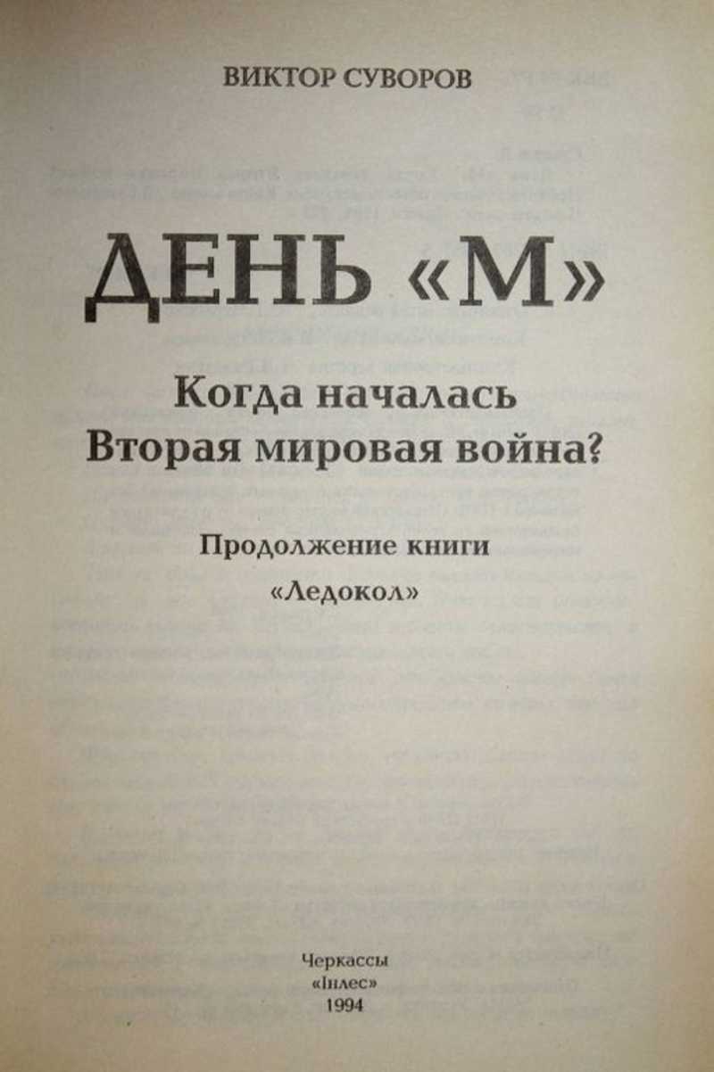 Виктор Суворов - псевдоним профессионального разведчика В. Б. Резуна, который в 1978 году бежал в Великобританию. В СССР заочно приговорен к смертной казни. В книге `День `М` автор предлагает свою версию начала Второй мировой войны.
