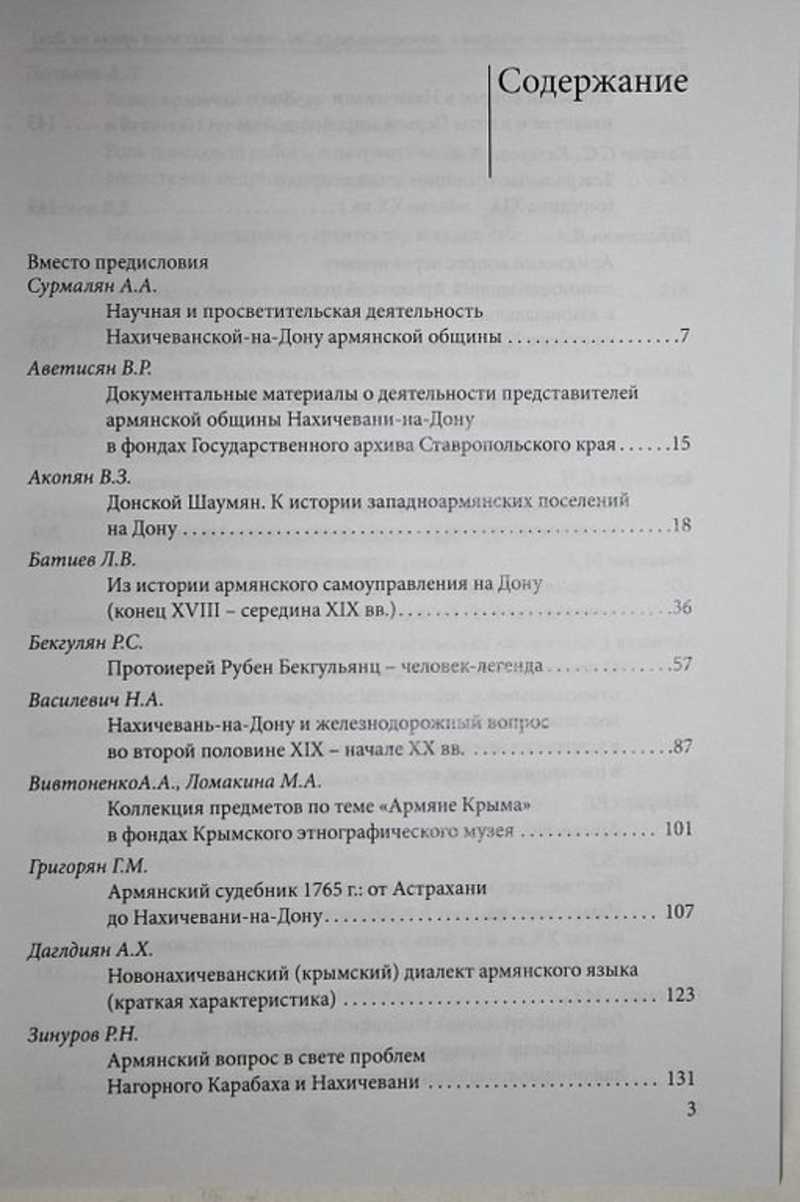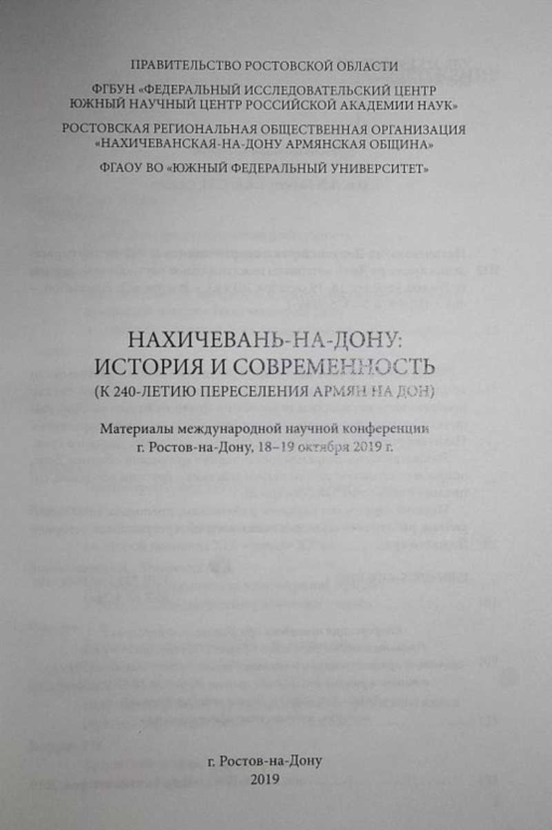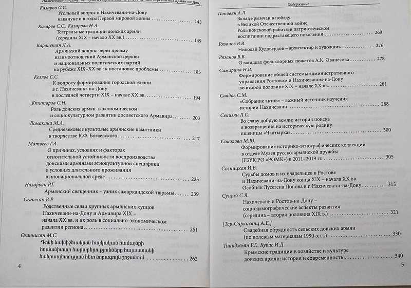 Материалы сборника охватывают различные аспекты деятельности армянской общины Дона. Авторами исследуются широкий спектр проблем, включая вопросы переселения армян из Крыма на Дон, различные аспекты экономического, политического культурного развития Нахичевани-на-Дону и армянских сельских поселений Донского края. Рассматривается современное состояние армянской общины Дона, вопросы ее этнокультурного взаимодействия с другими народами, социальной адаптации донских армян. Тираж 500 экз.