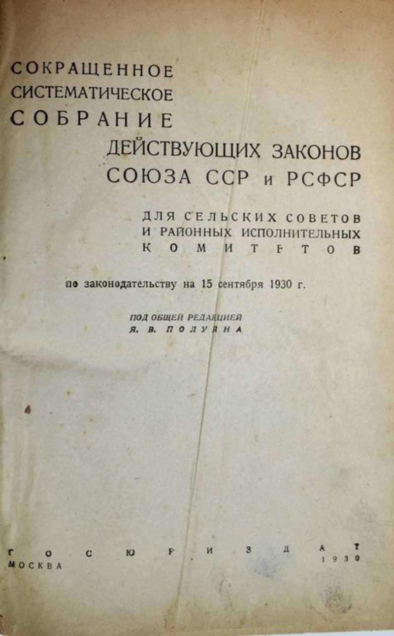 Сокращенное систематическое собрание действующих законов Союза ССР и РСФСР для сельских советов и районных исполнительных комитетов по законодательству на 15 сентября 1930 г